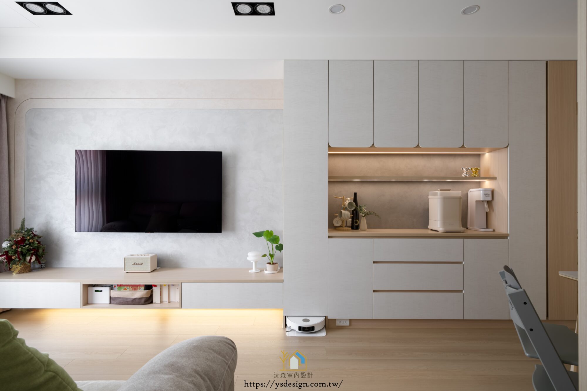 將收納櫃體一體化嵌入牆面,維持動線的平整與開闊感。中段鏤空的木質檯面配備了嵌入式燈條,營造暖意。這裡可以作為咖啡沖泡區或飲水站,讓玄關進入客廳的過渡區兼具實用機能。櫃門上方採用了弧形的開口設計,柔化了系統櫃僵硬的線條,呼應了全屋的「弧形」設計主題。